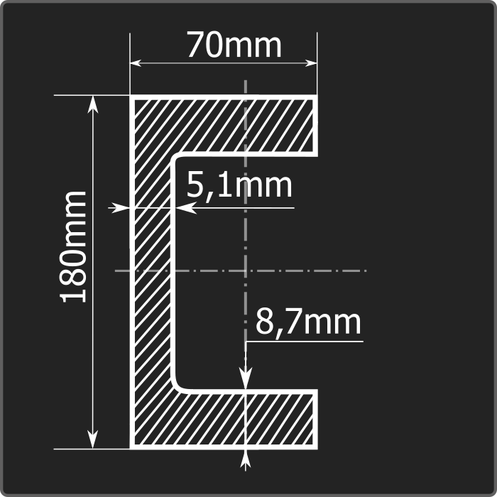 Швеллер стальной горячекатаный с параллельными гранями полок 18П и длиной 12м. Материал - углеродистая сталь. Соответствует требованиям ГОСТ 535-2005.