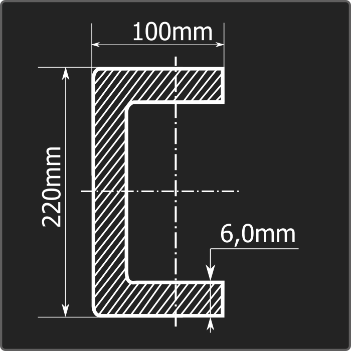 Швеллер стальной холоднокатаный гнутый равнополочный 220*100мм, толщиной 6,0мм и длиной 12м. Материал - углеродистая сталь. Соответствует требованиям ГОСТ 8278-83.