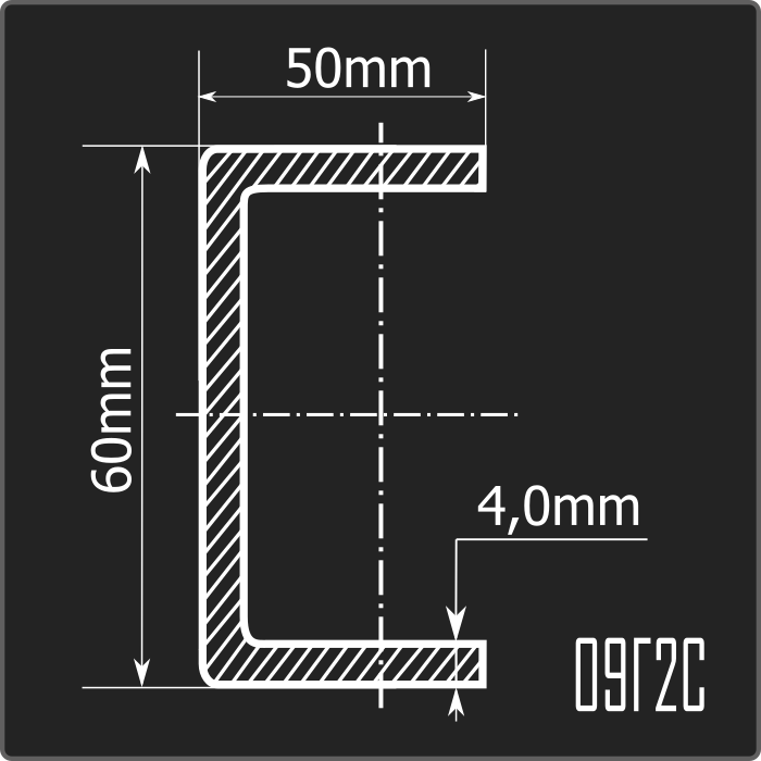 Швеллер стальной холоднокатаный гнутый равнополочный 60*50мм, толщиной 4,0мм и длиной 12м. Материал - низколегированная сталь. Соответствует требованиям ГОСТ 19281-2014.