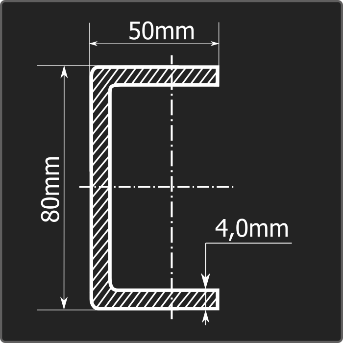 Швеллер стальной холоднокатаный гнутый равнополочный 80*50мм, толщиной 4,0мм и длиной 12м. Материал - углеродистая сталь. Соответствует требованиям ГОСТ 8278-83.