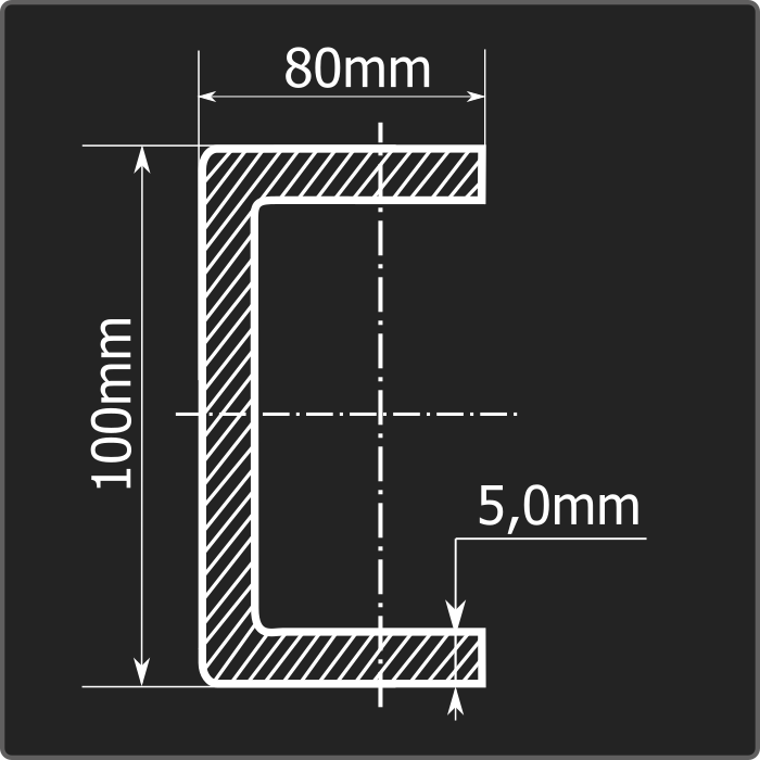 Швеллер стальной холоднокатаный гнутый равнополочный 100*80мм, толщиной 5,0мм и длиной 12м. Материал - углеродистая сталь. Соответствует требованиям ГОСТ 8278-83.