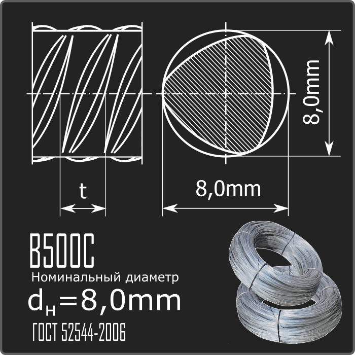 Арматурный прокат холоднодеформированный в мотках периодического профиля номинального диаметра dн 8,0мм класса В500 С (свариваемый). Расстояние между двумя соседними поперечными ребрами измеренное вдоль оси проката t = 6мм +/-15%. Соответствует требованиям ГОСТ 52544-2006.