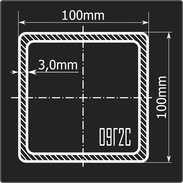 Труба профильная стальная квадратного сечения 100*100мм, длиной 12м и толщиной 3,0мм. Материал - низколегированная сталь. Соответствует требованиям ГОСТ 30245-2003.