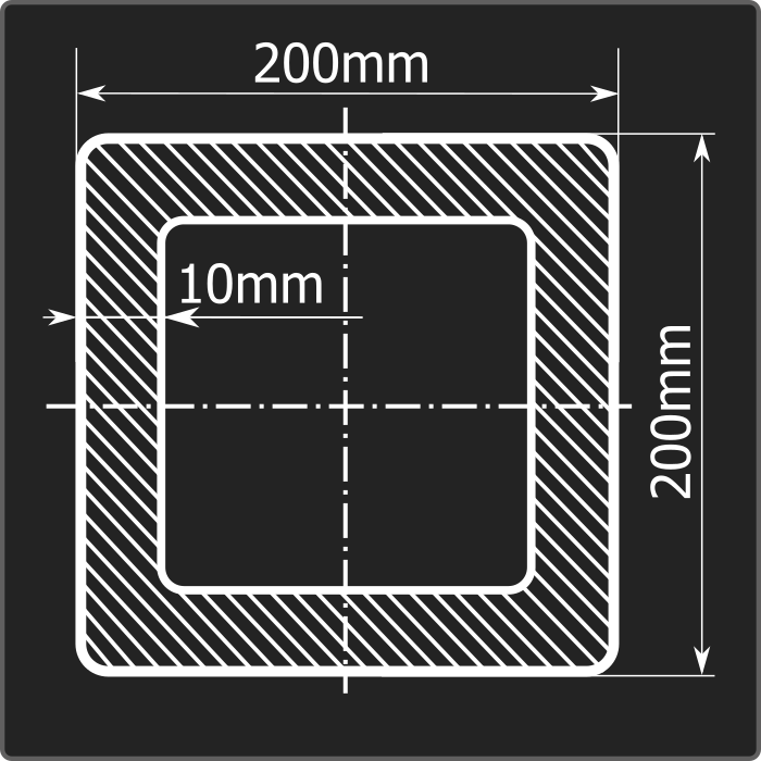 Труба профильная стальная квадратного сечения 200*200мм, длиной 12м и толщиной 10мм. Материал - углеродистая сталь. Соответствует требованиям ГОСТ 30245-2003. Стандартный пакет: вес - 6,152тн., количество - 9шт.