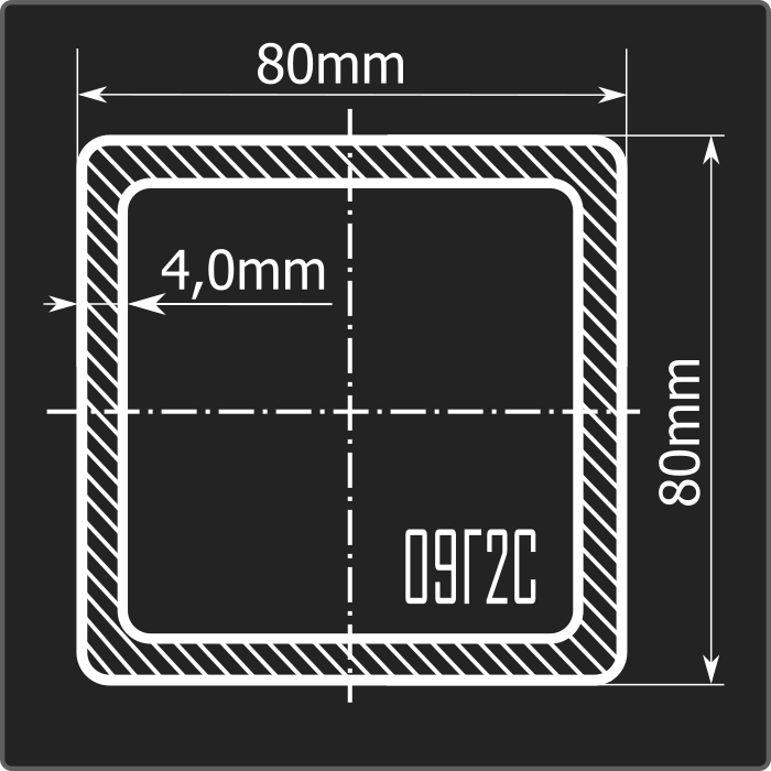 Труба профильная стальная квадратного сечения 80*80мм, длиной 12м и толщиной 4,0мм. Материал - низколегированная сталь. Соответствует требованиям ГОСТ 13663-86. Стандартный пакет: вес - 7,166тн., количество - 64шт.