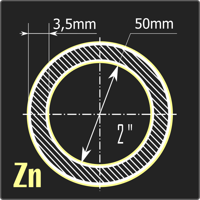 Труба стальная водогазопроводная оцинкованная внутренним диаметром 50мм, толщиной 3,5мм и длиной 6м. Тип покрытия – горячее цинкование ГОСТ 9.307-89. Материал - углеродистая сталь. Соответствует требованиям ГОСТ 3262-75.
