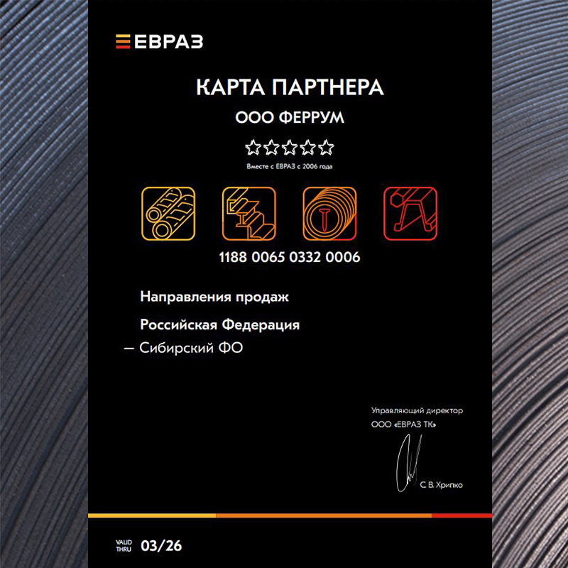Вместе с Евразом ФЕРРУМ с 2006 года, срок действия новой карты - 3 года. Она подтверждает партнерский статус и гарантирует подлинность и качество продукции.